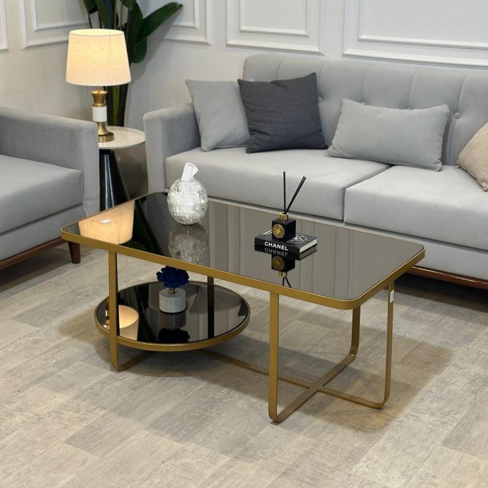 طاولة ضيافة أنيقة مكونة من دورين، بتصميم عصري يجمع بين الزجاج المرايا الفاخر والهيكل الحديدي القوي بلون ذهبي، مما يضفي لمسة فخامة وعصرية لأي مساحة.