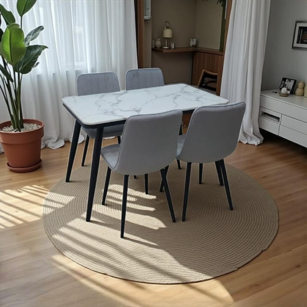 طاولة طعام فاخرة بتصميم أنيق تجمع بين الفخامة والعملية، تأتي بسطح رخام راقٍ باللون الرمادي يمنح لمسة عصرية راقية للمكان. تتّسع لأربعة كراسي مريحة بتصميم متناسق يضفي على غرفة الطعام جوًا من الأناقة والرقي.