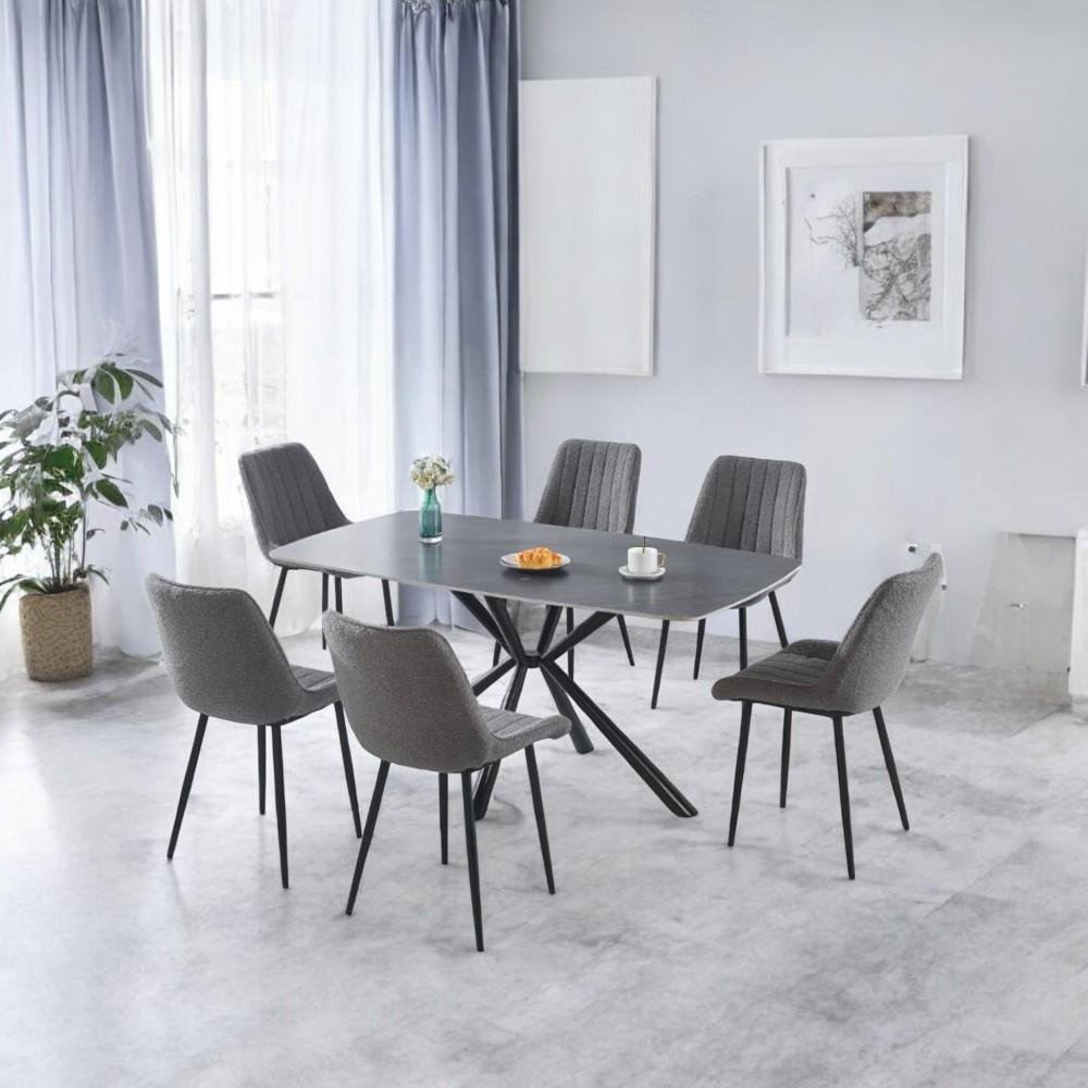 طاولة طعام سطح سيراميك رمادي مع 6 كراسي تتميز بتصميم عصري وأنيق، حيث يوفر السيراميك الأبيض سطحًا سهل التنظيف ومقاومًا للبقع. الكراسي تأتي بتصميم مريح وداعم مع قماش أو جلد مريح، مما يعزز من الراحة أثناء تناول الطعام. هي مثالية للمساحات الصغيرة والمتوسطة، وتضفي لمسة من الرقي على أي غرفة طعام. تشمل مميزاتها :