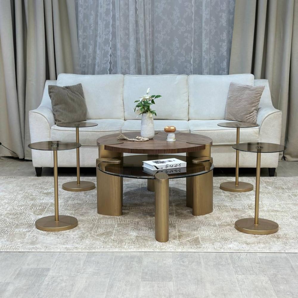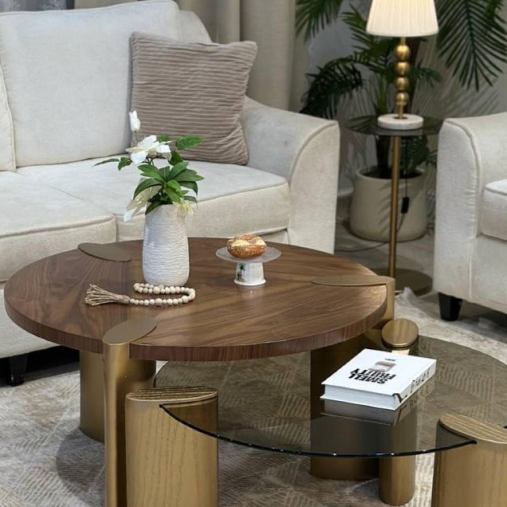 - طاوله متداخله بتصميم أنيق يجمع بين الخشب والزجاج مع لمسات من اللون الذهبي، مما يجعلها تضيف سحرًا خاصًا لأي مكان.
