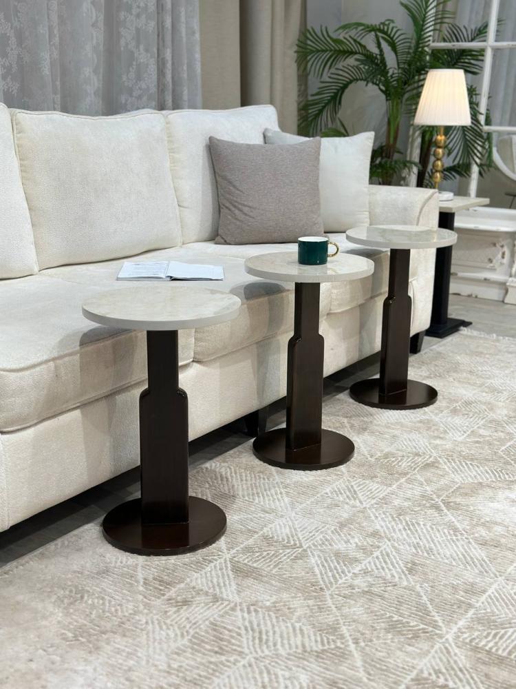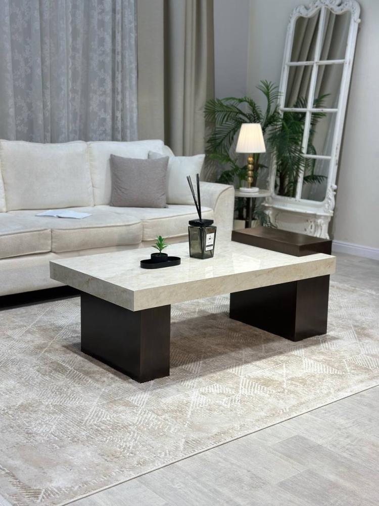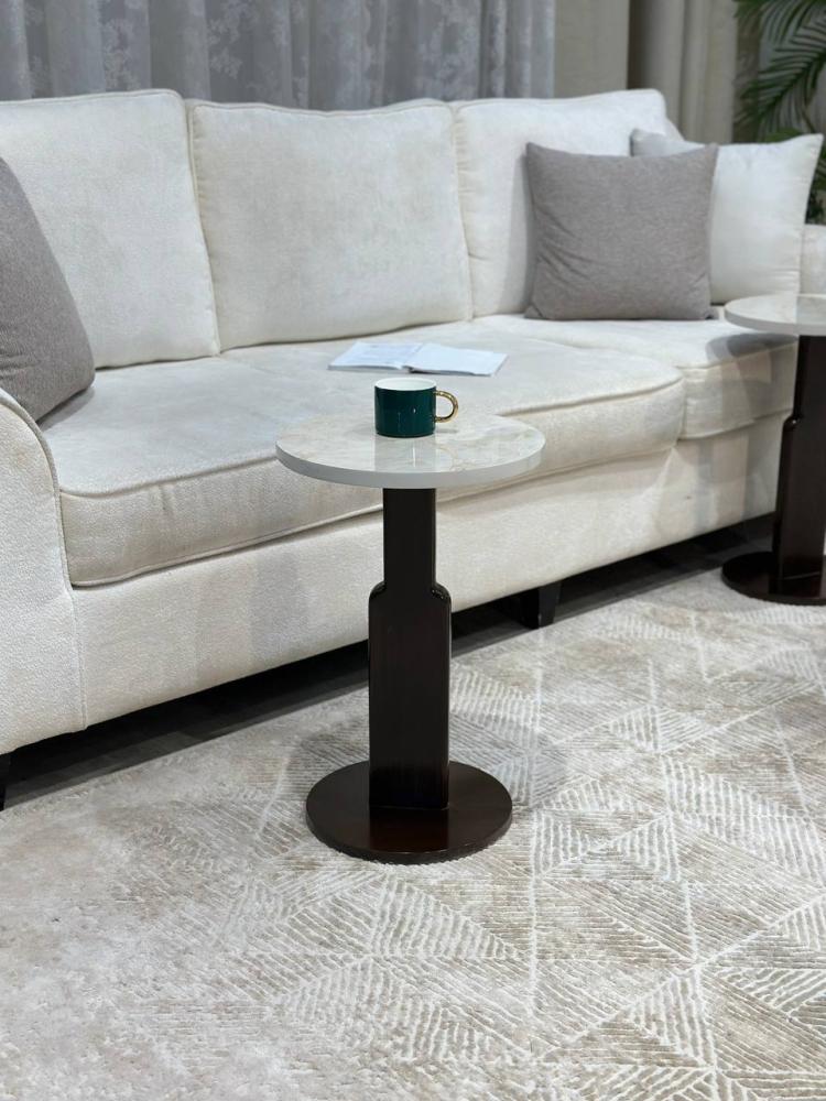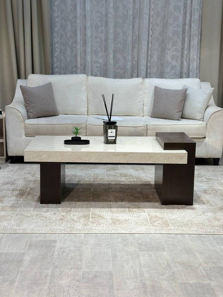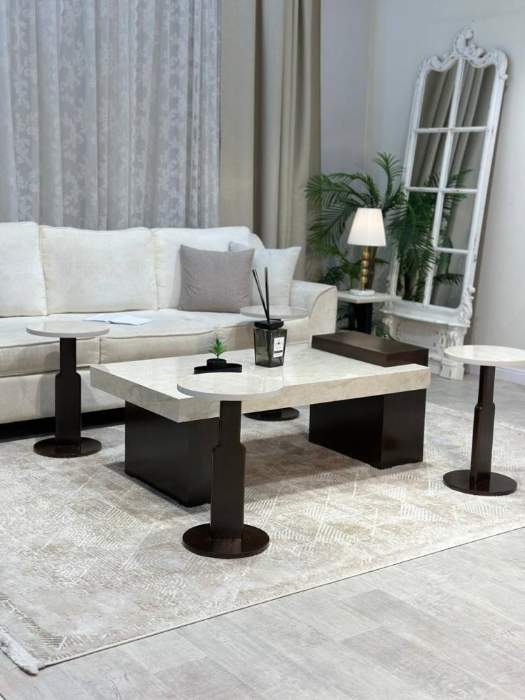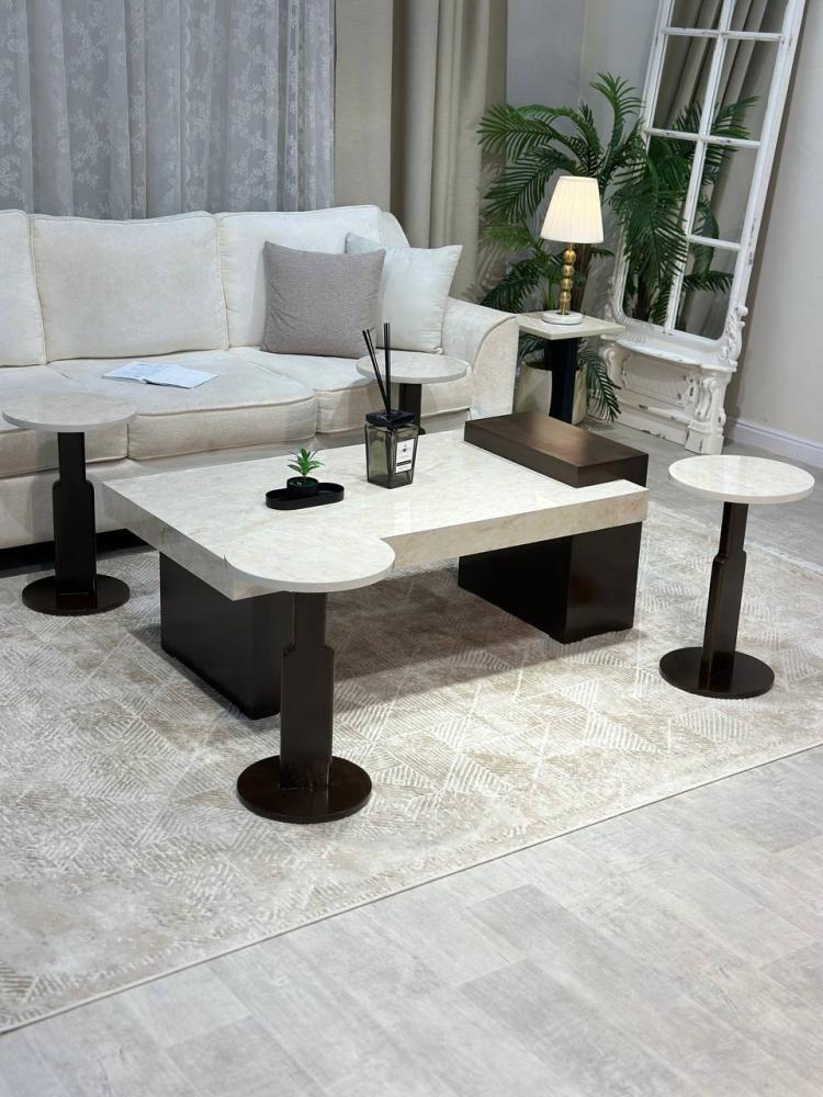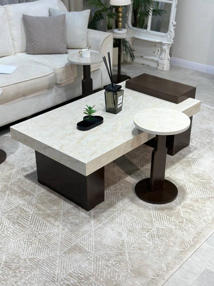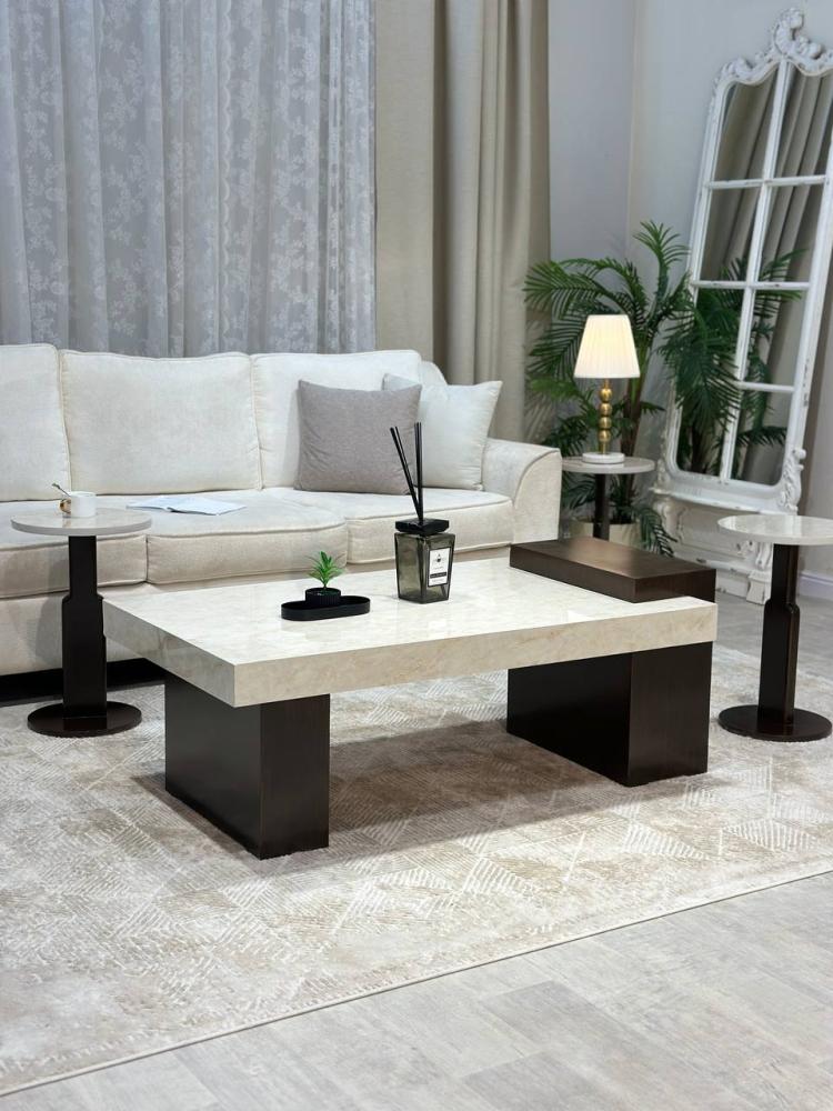 طقم طاولات ضيافة بديل الرخام مع قواعد خشب بني غامق – أناقة تلتقي بالعمليةأضف لمسة فاخرة إلى مجالسك مع هذا الطقم المميز الذي يجمع بين سطح بديل الرخام ا...