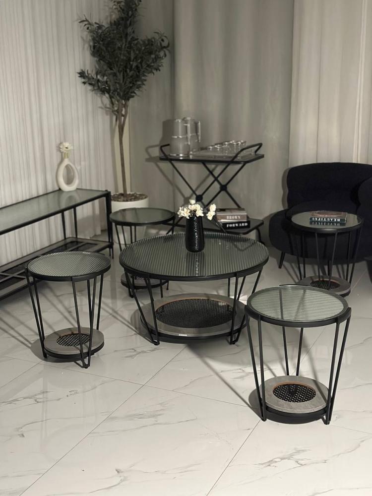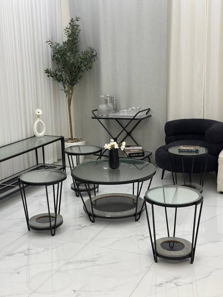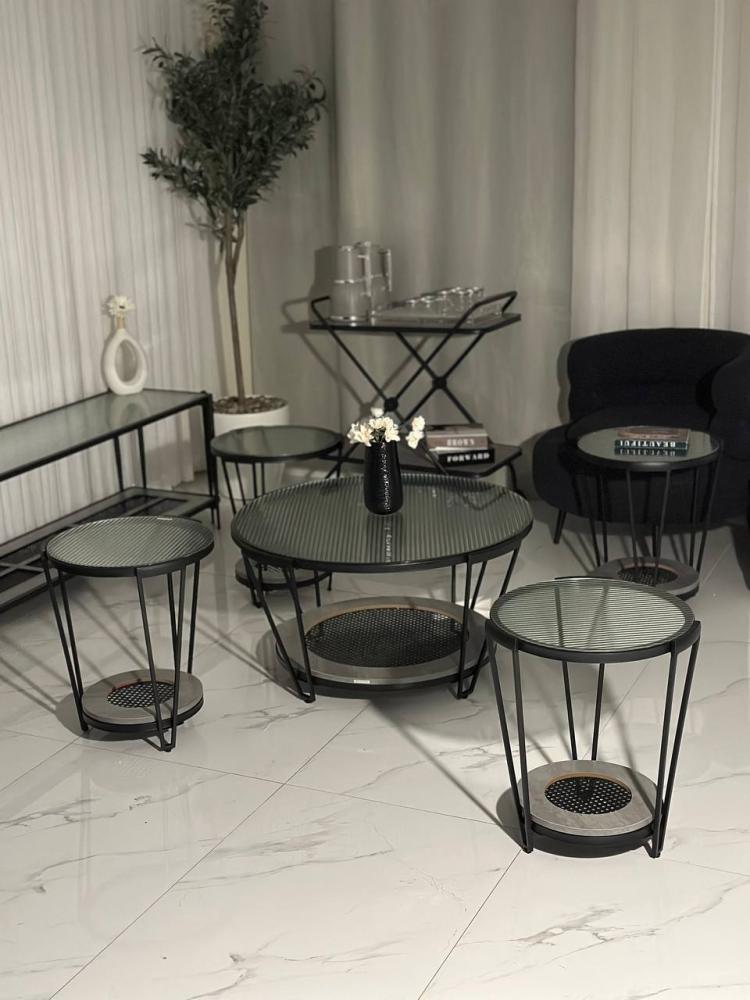 المزيدطقم طاولات ضيافة دورين خشب رمادي سطح زجاج شفاف مع 4 طاولات خدمة - بتصميم فاخر :