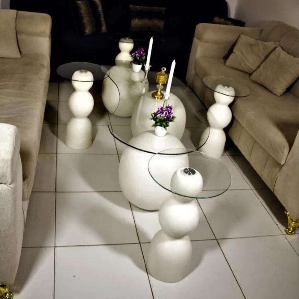 طقم الطاولات يتكون من طاولة رئيسية مصنوعة من الرخام بلون "أوف وايت" الناعم مع أربع طاولات خدمة صغيرة، ويتميز بتصميم عصري وأنيق يتناسب مع مختلف أنواع الديكورات الداخلية. تتميز الطاولة الرئيسية بسطح رخام فخم يضفي لمسة من الفخامة، بينما تأتي طاولات الخدمة الصغيرة بتصميم مدمج ومتناغم مع الطاولة الرئيسية.