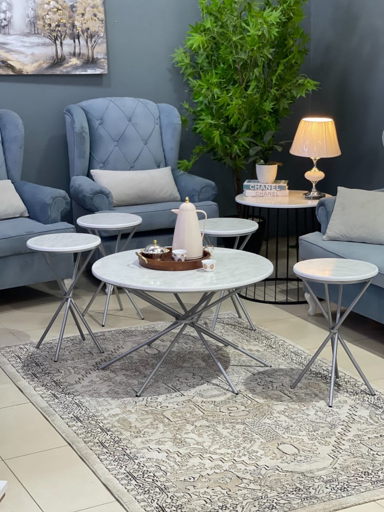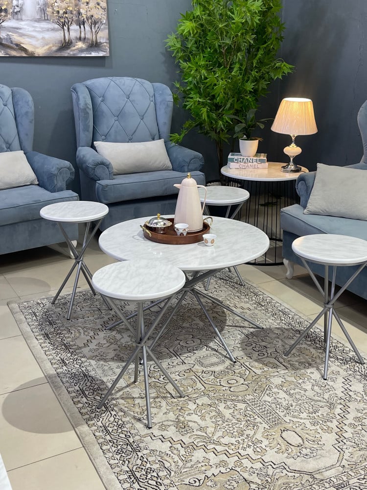 طقم طاولة أكس 5 قطع سطح خشب شكل رخام :طقم طاولة "أكس" مكوّن من 5 قطع أنيقة تشمل طاولة رئيسية وأربع طاولات جانبية صغيرة ، يأتي بسطح خشبي فاخر بطبقة تشب...