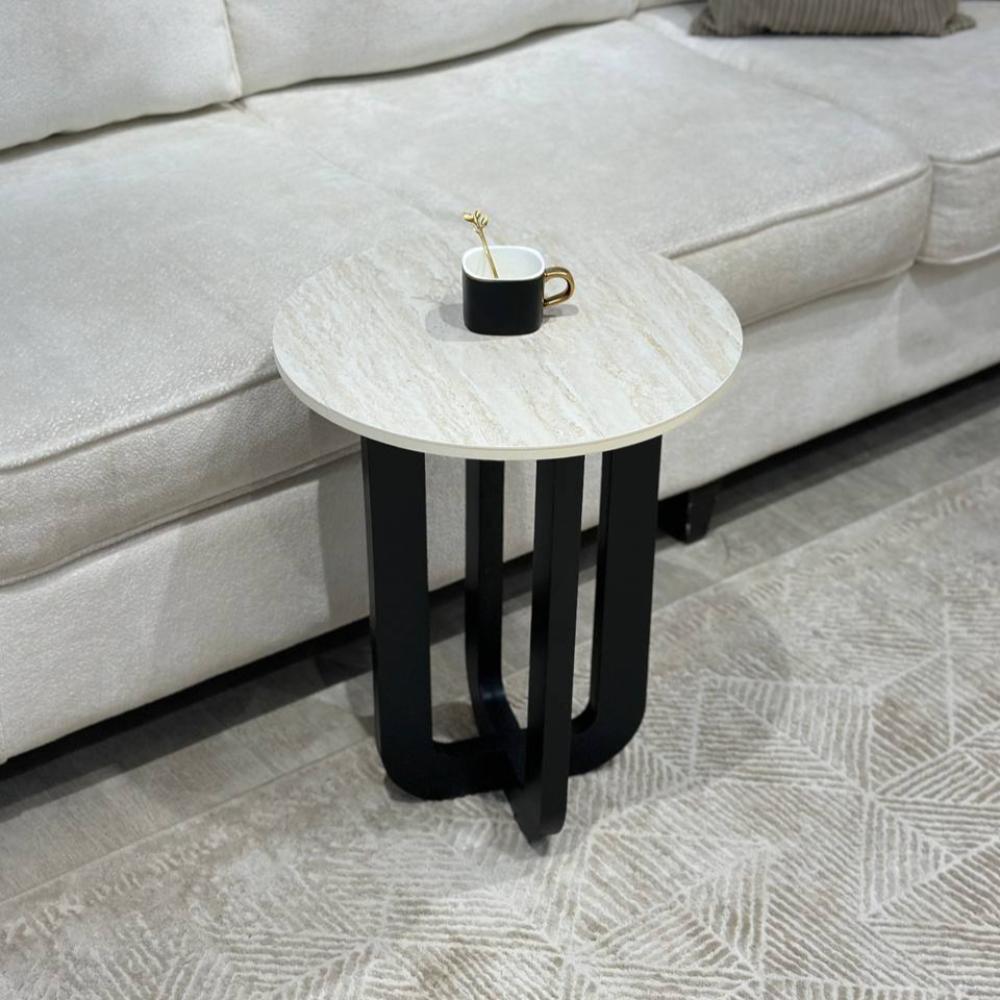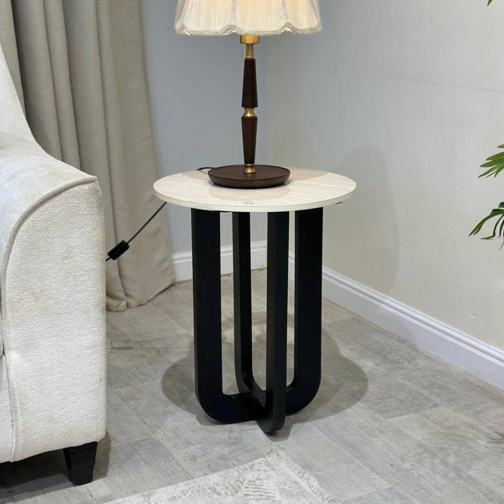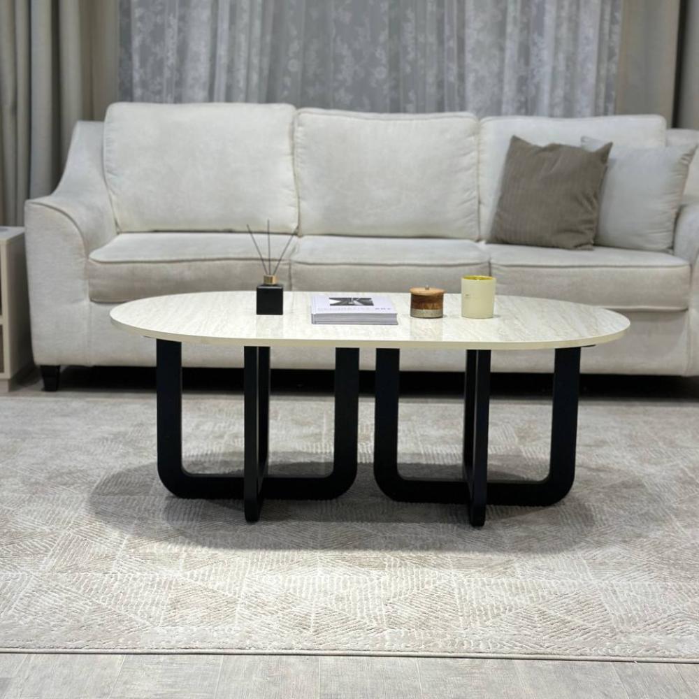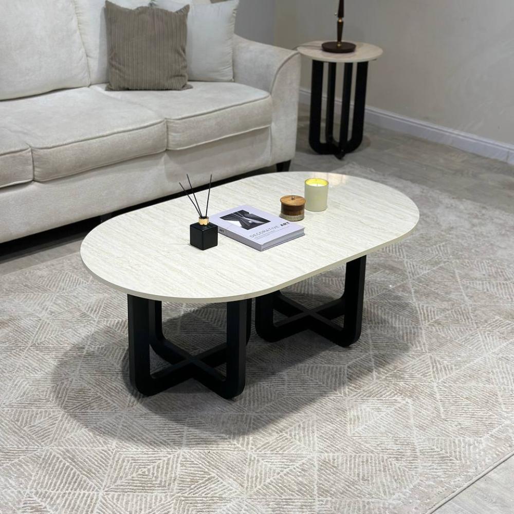 تأتي الطاولة الرئيسية بتصميم بيضاوي أنيق مع سطح من بديل الرخام عالي الجودة يمنح مظهرًا راقيًا أقرب إلى الرخام الطبيعي، مع ملمس سلس يسهل تنظيفه ويحافظ على جماله لسنوات. أما القواعد الخشبية باللون الأسود الداكن، فقد صممت بشكل هندسي مبتكر يعكس التوازن بين الفخامة والمتانة، ليكون الطقم قطعة فنية تضفي طابعًا مميزًا على أي مساحة.