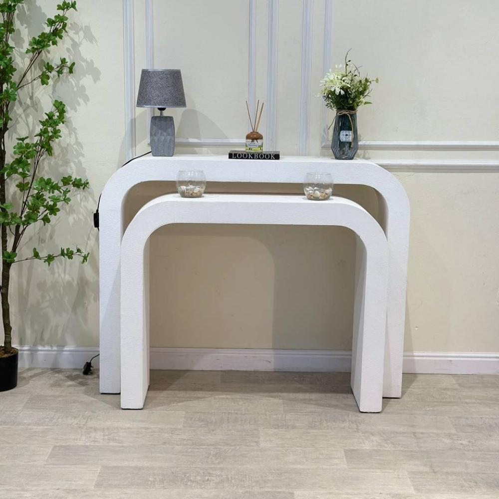 أضف لمسة من الرقي والجاذبية إلى مدخل منزلك مع طاولة الاستقبال المقوسة ذات التصميم العصري والأنيق. تأتي هذه الطاولة بلون ابيض فاتح
