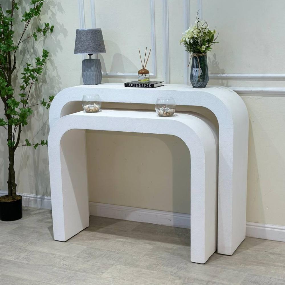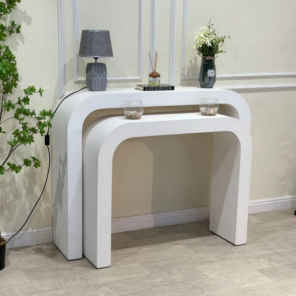 طقم مدخل استقبال مقوس – لون ابيض أنيق (قطعتان)أضف لمسة من الرقي والجاذبية إلى مدخل منزلك مع طاولة الاستقبال المقوسة ذات التصميم العصري والأنيق. تأتي ه...