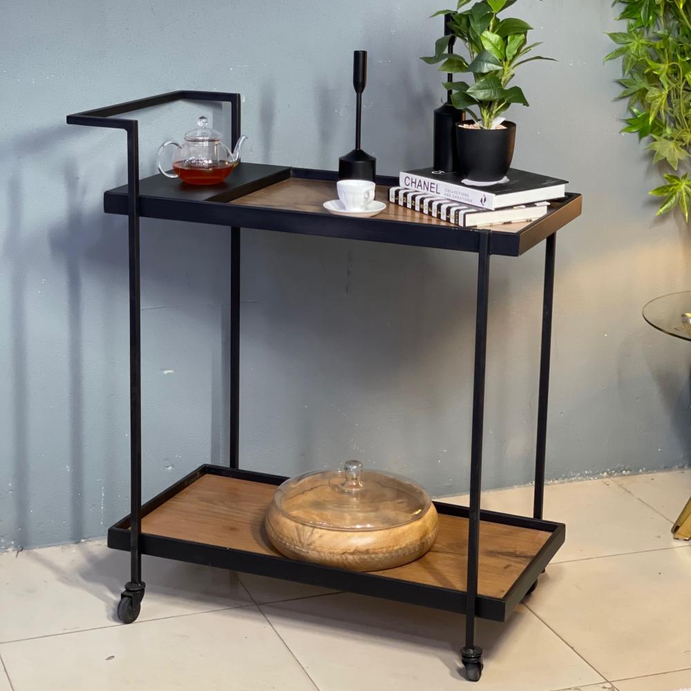 عربة تقديم خشب بني مستويين من الخدمة. في الطابق السفلي، يمكن وضع مجموعة متنوعة من الوجبات الخفيفة والمشروبات. في الطابق العلوي يمكن وضع أطباق ساخنة مح...