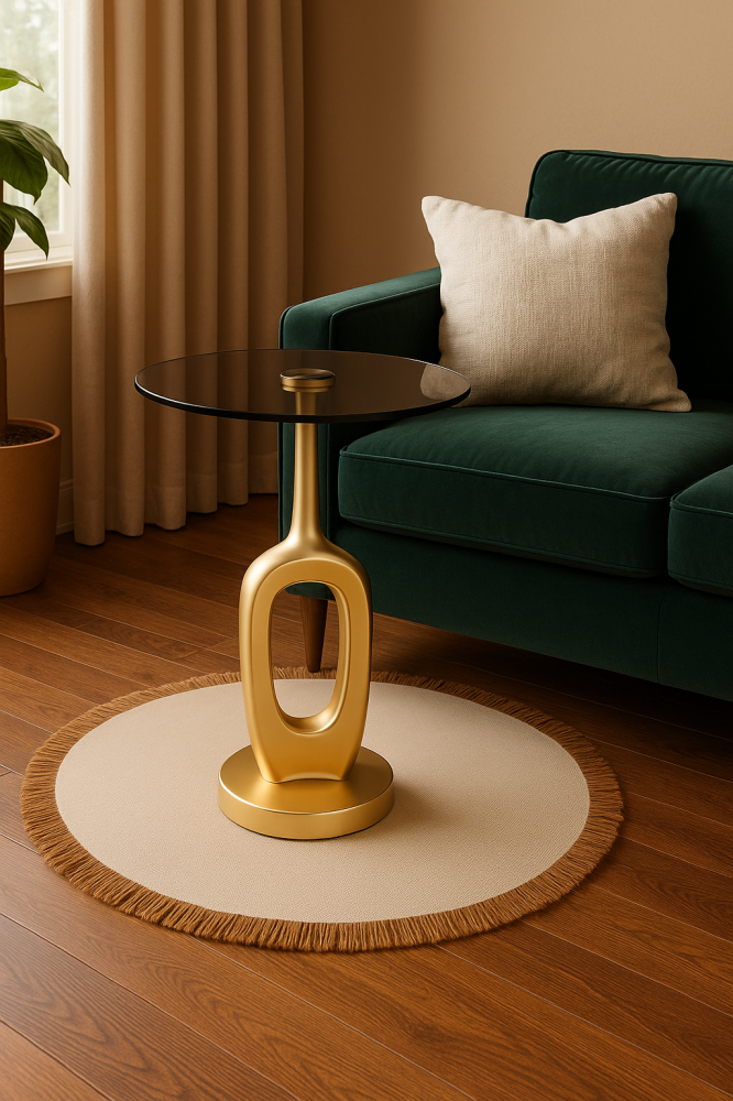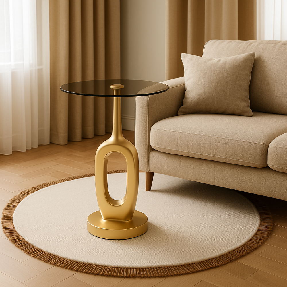 طاولة خدمة أنيقة بقاعدة رخامية باللون الذهبي وسطح زجاج بني شفاف، تجمع بين الفخامة والعصرية في تصميم واحد يضفي لمسة راقية على أي مساحة. تصميمها المتين والأنيق يجعلها قطعة مثالية لإبراز جمال ديكور منزلك.
